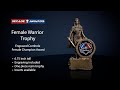 This award features a strong female who stands tall and exudes the force within her spirit and on the course. A magnificent warrior award has wonderful detail from her chain mail to the hilt of her sword.